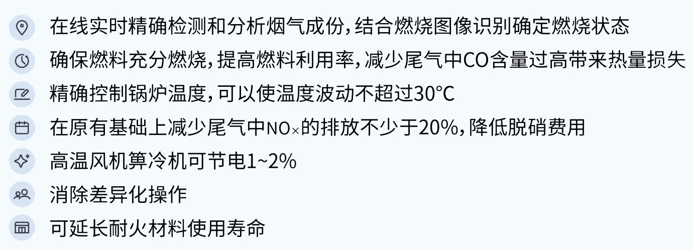 多入多出的神经网络算法,通过深度学习并根据负荷、温度等参数提前建模,实现燃烧过程超前精准调控,根据数据模型,提前3~15秒预测燃烧状态,降低检测分析滞后时间,达成理论上的完全燃烧控制与精益化管理。